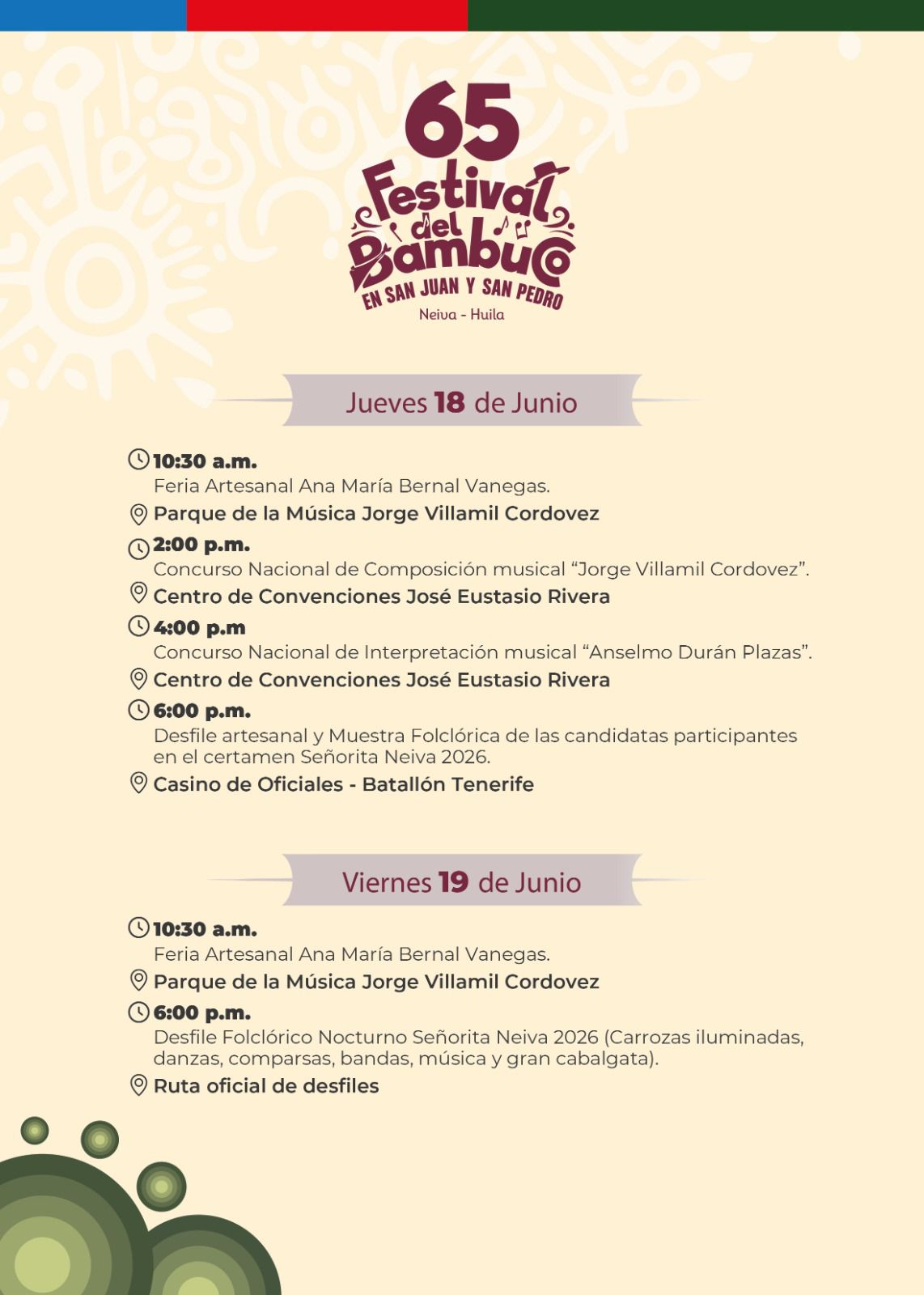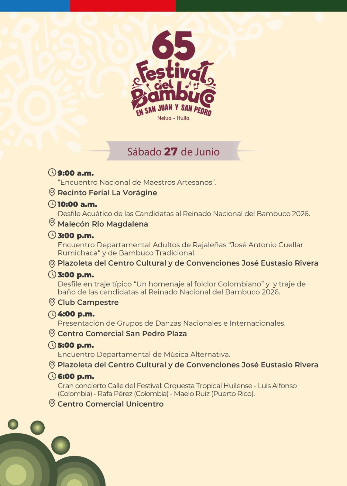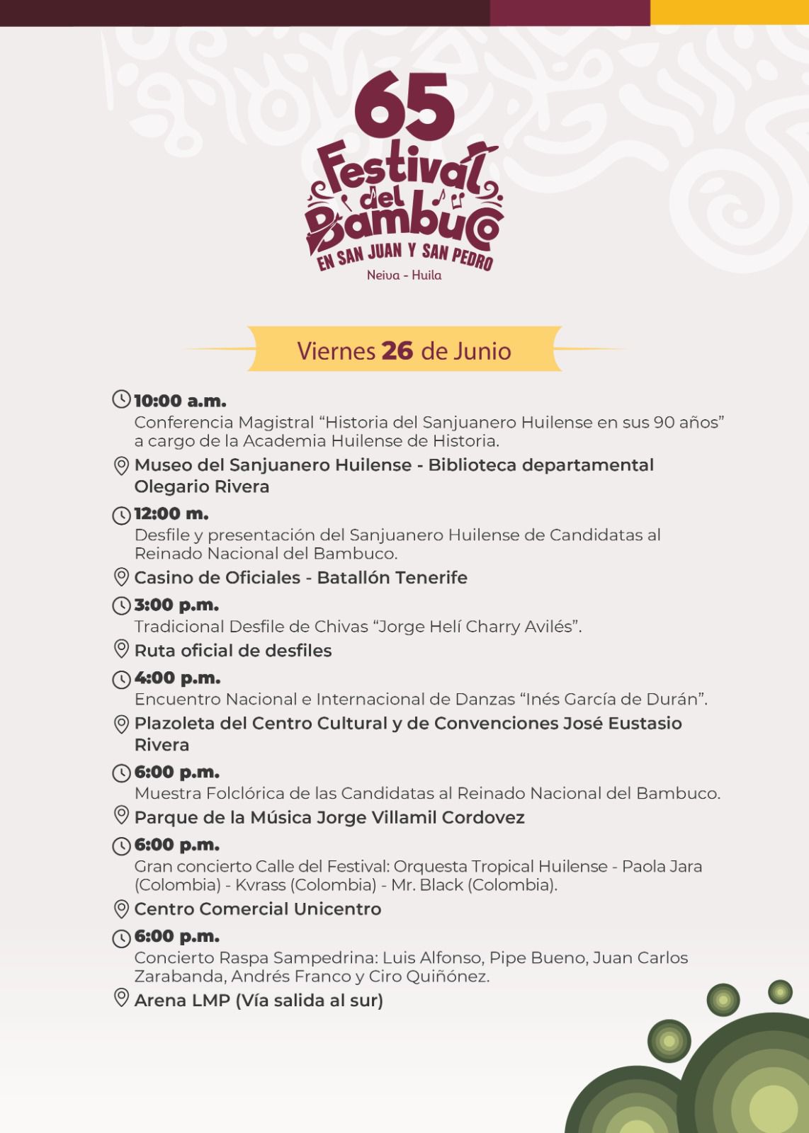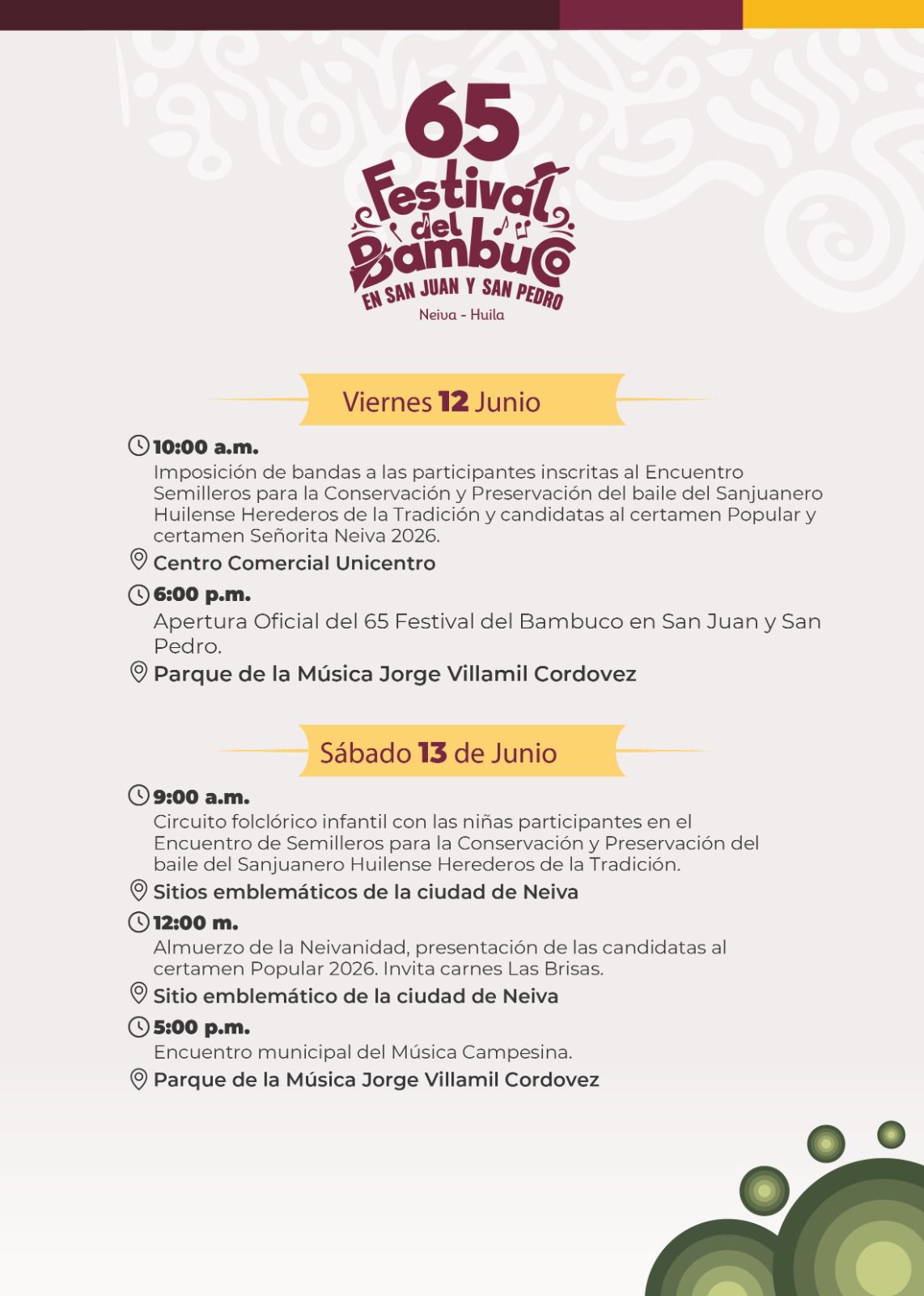 Esta es nuestra Programación Oficial del 65º Festival del Bambuco en San Juan y San Pedro 🌸🗓️