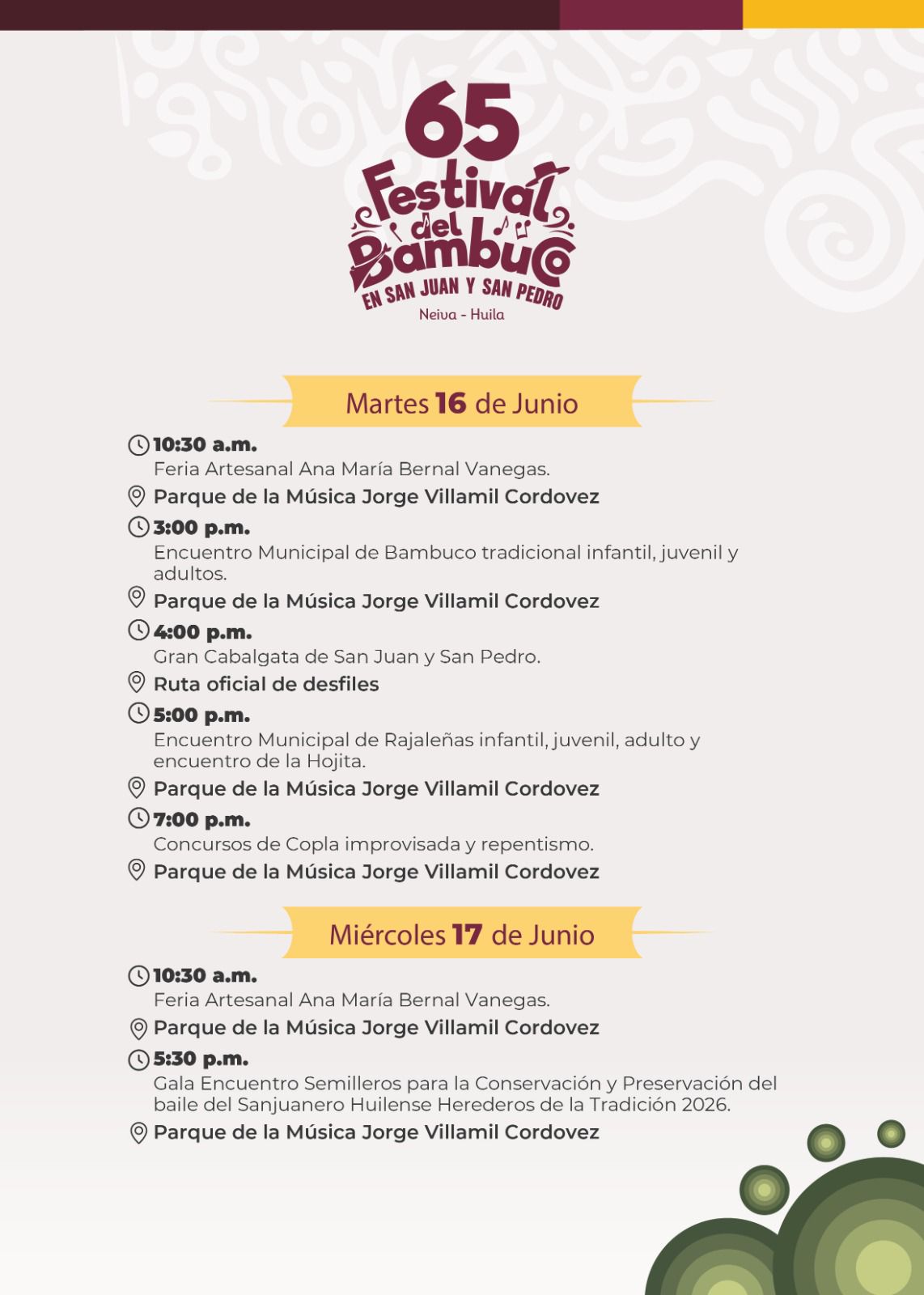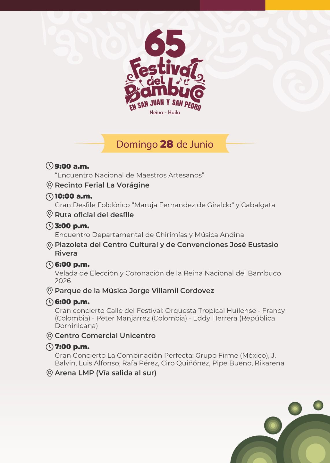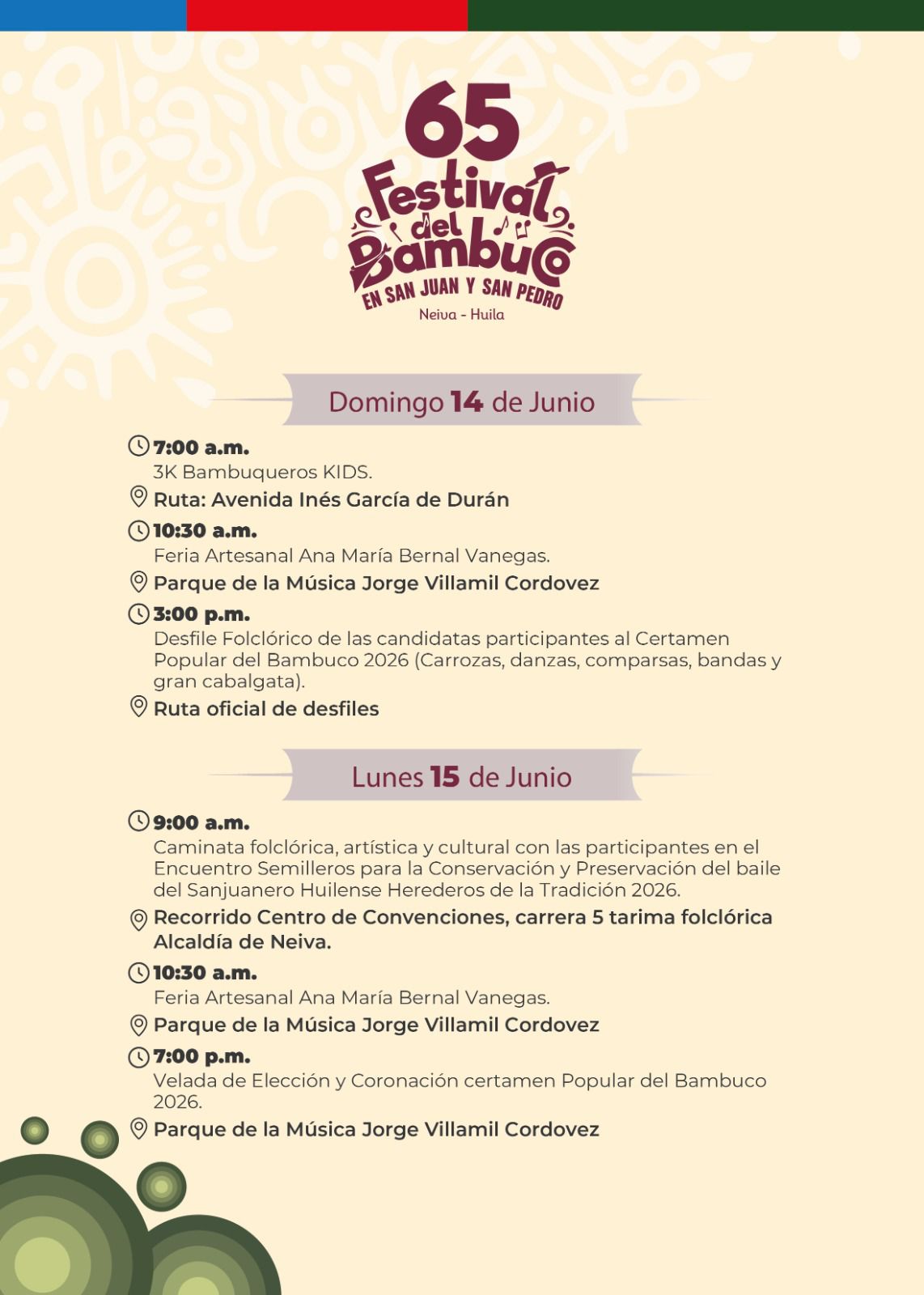 Esta es nuestra Programación Oficial del 65º Festival del Bambuco en San Juan y San Pedro 🌸🗓️