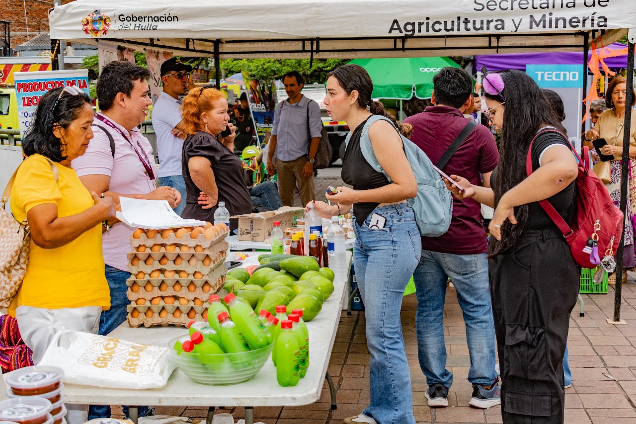Este importante ejercicio, enmarcado en la estrategia de circuitos cortos de comercialización, fue posible gracias a la articulación entre la Gobernación del Huila, la Secretaría de Agricultura y Minería, la Agencia de Desarrollo Rural (ADR), la Universidad Surcolombiana, la UNAD, Asocoop, Uniminuto, la CAM, el SENA, la Alcaldía de Neiva, la Pastoral Social, la Cámara de Comercio del Huila, Prosperidad Social, entre otros aliados. Gracias a este trabajo conjunto, se brindó un valioso espacio de comercialización y visibilidad a los pequeños productores, organizaciones sociales y emprendedores que le apuestan al desarrollo rural y a la transformación productiva del departamento.